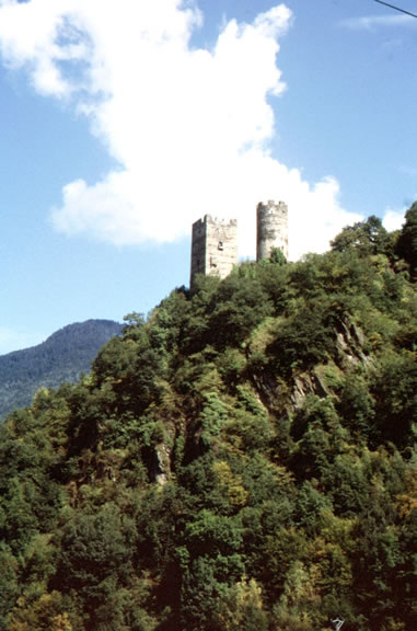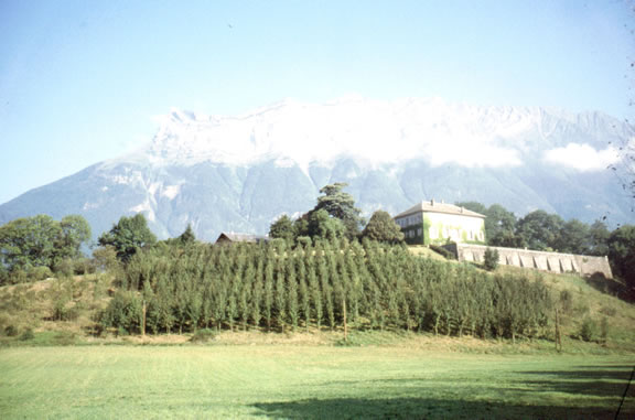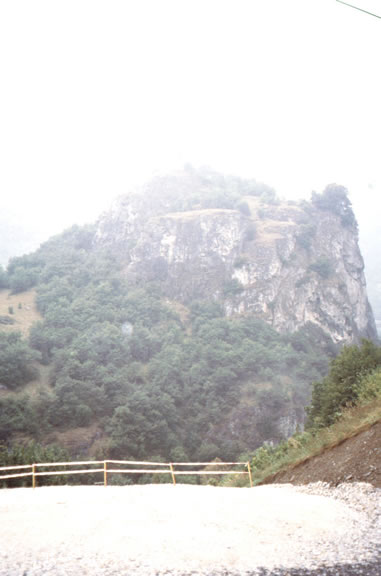 The bike path led us to Aime, where we foolishly chose to press on. John's eyes lit up as he talked about La Plagne. His hero Stephen Roche had a fabulous comeback on this climb in the 1987 tour, which he won. It's a cul de sac climb, so we didn't plan to do it. What we climbed paralleled it for a while, but was certainly more than we were expecting and several times, we checked th map to be sure, we weren't on the climb. Then the weather turned. We had a fierce thunderstorm, and tried several times for accomodations, but to no avail. Then we got to come down off the ridge. We hit the most incredible series of switchbacks. Our drum brake got serious exercise here, as it was on and release in the corner, then on and release 40 or 50 times! Coming around one corner a church appeared floating out in the haze. We stopped as quickly as we could, but were unwilling to climb back up to get the more dramatic picture.