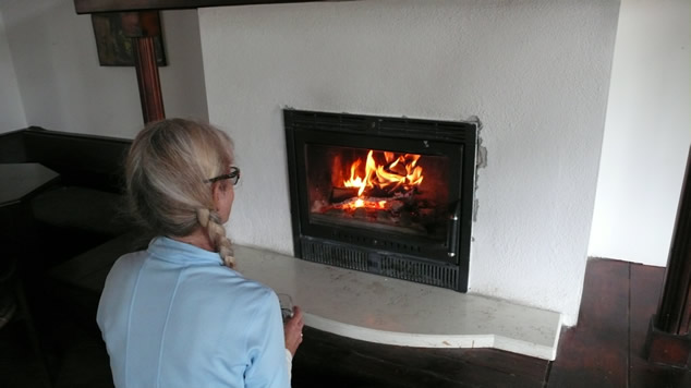 We did at least have a warm fire at lunch - the first of the trip - and well appreciated. Here is Pamela worshipping the fire god!