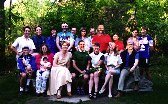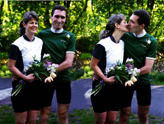 On a perfect spring day, the civil ceremony (no harsh words passed!) was performed by a justice of the peace (who was probably the only non-cyclist present) at the Al Lester memorial, on the Minute Man Commuter Bikeway, in Lexington Massachusetts. Pamela arrived from the East, on her Softride solo; John rolled in from the West on his new Rivendell solo; after the cermony they pedaled away on their Rodriguez tandem (in-phase cranks). The bride wore a black and white damask cycling jersey, black Lycra shorts and SPD sandals; the groom: kelly green, black shorts, and Sidi shoes. A delicious edge of danger and excitement was provided by the the steady stream of rollerskaters and cyclists as they whizzed past the milling throng, especially when the justice of the Peace backed across the trail to take group photos. It was a lovely event, concluding with the company assembled reading the old Irish blessing: