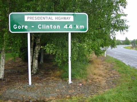 We showered quickly and headed out for that great looking antipasto, only to find the cafe closed early on Sunday, so instead we devoured an great Indian meal. The winds had died down a bit from our day at Lake Tekapo, but so had the sunshine. It was a bit cool and overcast for our rides. So sure enough on Monday when we had planned to visit Puzzling World, the sun was bright and glorious. We spent the morning at the puzzle museum, followed by a bit of time inside a great maze where one of us took longer than the other... Then we drove over to Queenstown, where we checked out the shops and avoided the hype and adrenaline activities that the town in so famous for. We'd planned to do a bit of offroad riding the next day, but some serious rain set in, so we changed our plans and decided to just head straight for Dunedin, passing through the towns of Clinton and Gore on the way. The sign makers here have a good sense of humour!