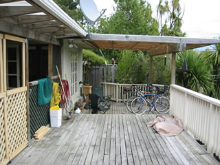 Replacing our cement roof with a much lighter steel one should make our doors open and close better, at least so goes the theory. We will see. With less weight pressing down, it really should be better. We are planning to redo the locks - every door has a different lock - and different type. I'd just like to put in simple deadbolts that prevent accidental lockouts. Now, I've also mentioned the lack of heat here in previous diary entries. New England folks must find this very interesting. We had changed our heat in our Massachusetts house to something non-conventional. We replaced the 55 year old inefficient, poor heating oil furnace, with a multi-zone clean gas burning system. We had 4 free-standing gas stoves, running off independent thermostats. This gave us a nice attractive warm heat that we could control from room to room. If we weren't using a room, we didn't have to keep it as warm. And if we did want one toasty, we didn't have to heat up the whole house. We loved it, and it really was cheaper. But when we sold, we had an issue with New Englanders wanting traditional central heat, and it took some explanations. In the end we had a buyer who totally appreciated the efficiency of the system. So when we came here, we were amazed that many houses had no central heat, and often no permanent source of heat at all. Some used woodstoves, but many used portable electric space heaters. This wasn't just in temperate Nelson, but we saw this is Christchurch and Dunedin! So the next thing we are doing is getting a gas heat stove! We've actually found the same model we had in our kitchen in Massachusetts (of the four, it was our favourite). We will have it put in right after the roof goes on. We need to do it in this order, since it will vent through the roof. The deck is one of the greatest features of the house. It is enormous - almost as big as the house. It stretches across the full length, and is as deep as most of the house. The house is 110 sq. metres - while the deck is 90 sq. metres. A large part of the deck is covered, great for both sun and rain protection. The sun is quite intense here, and a cover is critical to sit out on the deck for long on a sunny day. It's also great because it gives us a covered place to hang our clothes out to dry when it does rain. We have a hot tub on the deck, and it does get regular use. The area around the hot tub was partially closed in with walls of lattice. We built a gate, and closed in the upper parts with mesh, so the cats could join us outside.