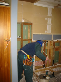 Monday, Brad and Dave, the electricians from Crabb Electrical came to do the electrical prep work. These guys did work for us when we put in the new hot water heater, and we liked them enough to invite them back. We were moving lots of outlets in the kitchen, and also doing some work throughout the house. I hadn't quite finished getting one of the cupboards out and Noel came up to help rip it down, so they could get the wires placed! One strong guy with a big crowbar, and the pantry was out. I got the rest of the stuff out and piled up on the deck. Yes, the deck is quite full with old cupboards as well as the workshop, laundry, outdoor furniture, etc. Good thing the deck is almost as big as the house! I also had Brad and company redo some lights in the rest of the house and get the new room ready for gib. But one of my high priority requests was to hide the honking big transformer. We need it for our coffee station - the espresso machine, frothers and grinder that we brought from the States, as well as the vacuum. It's a 2000 watt unit, and is an industrial piece of equipment. I wanted to get this thing off the countertop. He said no problem to move it and wire up a couple of American outlets. It has proved to be more trouble than we anticipated, and I'm waiting to hear back from tech support (from the place I bought it about some of our issues).