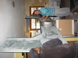 The one and only glitch in the process was our countertop. It wasn't ready when we were, so we lost a day. This meant I had Thursday free to go play. I ran a few errands, including loading the van with all the rubbish from the wall board removal. Then mid day Friday the counter top showed up. It took three strong guys and lots of twists and turns to get it in. There was a slight problem with one of the angles, but being a resin on pressboard design, they were able to redo it in place, but this did delay things a bit. I had booked Bob and Simon to hook up gas and water that afternoon, but we'd now have to wait til Monday. I had really hoped to have plumbing for the weekend, but I was coping OK and would just have to continue washing dishes in the laundry basin and eating sandwiches and rice. (I could use the breadmaker and rice cooker, and the oven worked.) The countertop actually came in two pieces, and once the angle was repaired, the two pieces were glued together with the same resin so it looks seamless. Darin came out Saturday afternoon and Sunday morning to get this all set. This top looks like a fancy corian top, but as a resin, it can be easily cut to an odd size, and repaired. It is also much less expensive. We had delays, but I would do this same Domani top again and recommend it to friends. It looks good!