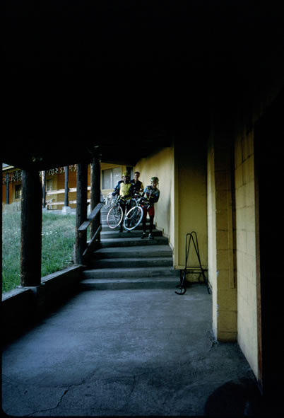 Carrying the bikes down for breakfast