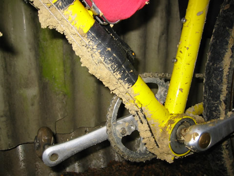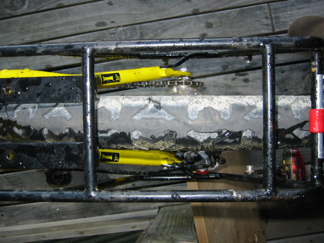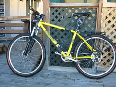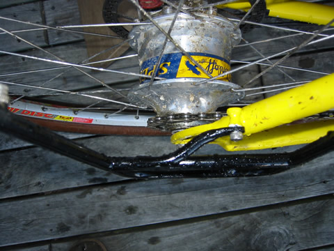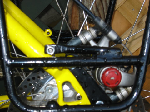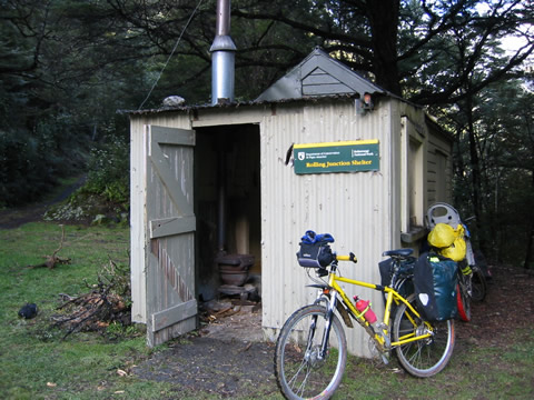 It was only a three day tour, but it did give us a chance to get away mid winter. There are heaps of huts accessible from gravel roads like this one, so we will likely do a few more of this type of trip. I did make one significant change after the ride. This was the first time I had use my new mountain bike for a tour, and I needed to do something different with the rack. But before describing the modification, first I'll offer a bit of background on this bike. Before coming to New Zealand, John and I had a couple of mountain bikes built. John was quite taken with the idea of Rohloff hubs and their simplicity of maintenance, lack of chain suck, and lack of derailleurs sticking out to snag passing limbs! We also decided to go with S+S couplers, having experienced how much easier they make travel on the tandem, and disk brakes, again to reduce maintenance (won't have to replace rims so often). We had a bit of a battle getting our frames delivered before leaving the US, but that's another story that John will someday write up and put on the web page, along with technical info on the Rohloff, couplers, and other features of these bike. One of the complications, according to the folks at Independent Fabrications who built the bikes, was using a rack with the disk brakes. The rack eyelets are above the mount for the disk brakes, meaning that a rack will be much higher than normal. This was the first time I'd even tried a rack on the bike, and I did find the higher centre of gravity made things less stable. (See pix at top of page). So after I got back, I rode down to a local engineering firm, and asked if they could modify my rack to mount lower. One of the reasons for having a tubular steel rack is that you can repair or modify it, right? So it was about time that I did this. They first suggested cutting off the lower part of the rack to clear the brake mechanism, but I didn't really want to do this to my very pricey Bruce Gordon rack. And I might want to use it on another bike someday. So we decided to spread the bottom, and add new mounting points that would clear the brake and lower the rack to just above the tyre. You can see the results below. I am happy to report that it has worked out quite well. I've been using small panniers (with lunch, vacuum bottle and warm clothes) on this bike for Sunday rides, with great luck.