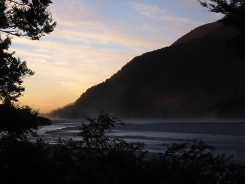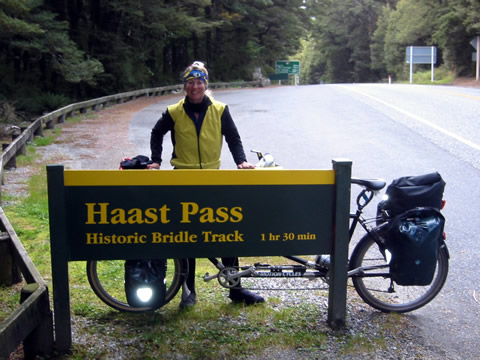 We would have loved to stay in Wanaka to see the show, but most places had been booked out for two years! As it was, it was hard enough to find places up the road over Easter weekend. I phoned ahead to book for several days. I found a motel room in Haast. The only BBH hostel in Fox Glacier was full. They gave me the number of another place, where we made a booking. After leaving Wanaka, we came upon another touring cyclist, going our way. Gilly was over from Oz, doing a similar trip to us, cycling around the south island and doingthe odd tramp. We exchanged addresses and offered her a place to stay on her way through Nelson. The next touring cyclist we encountered was at our hostel in Haast. Martin came in a while before us, and had been asked if he'd passed a female cyclist. Even though I made a reservation for two, the folks running the place were concerned that I was alone and late. (We arrived with our lights on, just as it was getting dark.) Martin was from the IK and was travelling around the world for a year. he was planning to spend some time touring the west coast of the USA, and we offered tips on all our favourite spots there. We also offered accomodation in Nelson, if we were back when he came through. We saw each other several more times over the next few days, but lost touch when we stayed an extra day in Franz Josef to climb the glacier. When we got to the Fox Glacier Inn, there was a mix up with our reservation. Normally when booking with BBH, I put a mark in the book next to where we are staying. Since this wasn't BBH, I had a note with the name and phone number and type of room. I also recall giving them a credit card number. At some point, the clerk seemed to locate my erased card number. But they had given our beds away. Conveniently, for them, they had a much more expensive room that we could have. With no choice other than sleeping in a ditch we took it. They did at least warn us about the saddle attacking keas - we hadn't expected them at this elevation. They didn't tell us that they run a bar, and the backpackers/motel is simply a way to get customers in the bar. When we tried to use the kitchen, we found that one burner might work. There were two pots and a pan, one glass, two cups and a few bowls. This was for 50 or so backpackers. We have stayed in lots of backpacker hostels in our time here, and this was the worst. I will say at this point that our experience with YHA and BBH hostels has been really good - they are all pretty high standards. Any time we have been disappointed, it has been a hostel outside of these two networks. The next day, we went to the Café Nevé and spent the morning drinking coffee and writing postcards. We had planned to either walk on Fox or Franz Joesef Glacier depending on the weather. It was only 25km of hilly riding to Franz Josef, so we could walk at Fox and ride, or ride to Franz Josef, and walk that day or even the next. We woke to pouring rain, so we stalled in Fox. We stayed at the café long enough to have pizza. We'd had one there before about a year ago, and remembered it quite fondly. The pizza was good and it was nice to avoid the rain for a while. Once we couldn't stall any longer, we headed out into the rain and up and down three big twisty hills to Franz Josef. We booked a walk for the next day and planned to stay two nights in town. Click here to see photos from our walk.