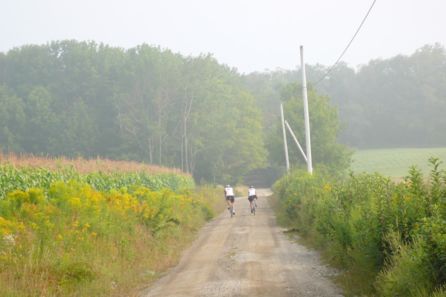 D2R2 2007In 2007, D2R2 was held on the hottest day of the year. John, Don and Pete arose before dawn and made French toast and bacon, setting off the smoke alrm in the process. Dena and Pamela managed to get back to sleep in spite of this. The lads got an early start, when the temps were still a moderate 90! One might think that Pamela and Dena were wise to chose the shorter 100Km option, but they missed the coolest part of the day, and no one who saw them struggling up those hills with their single speed machines would have called them wise!
