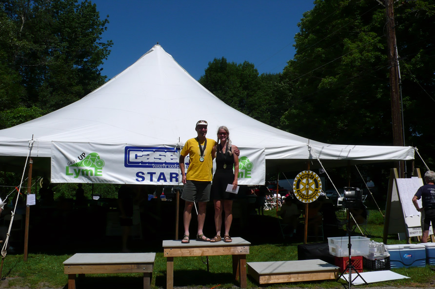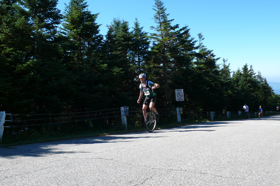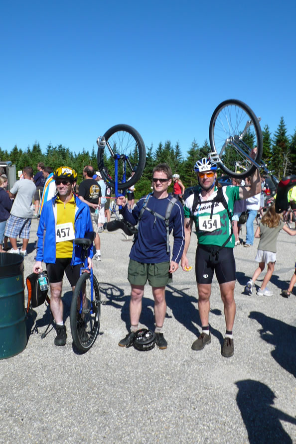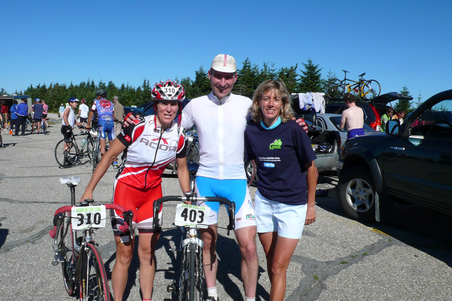 Mt Equinox 2007Dominique (on the left of John) and Cristine (to his right) saw us pedaling along ab out of the way road in vermont in July and stopped to say hello. It turned out they had just raced up Mt Ascutney the day before. They encouraged us to do the race up Mt Equinox, so we did, and had company at the top!